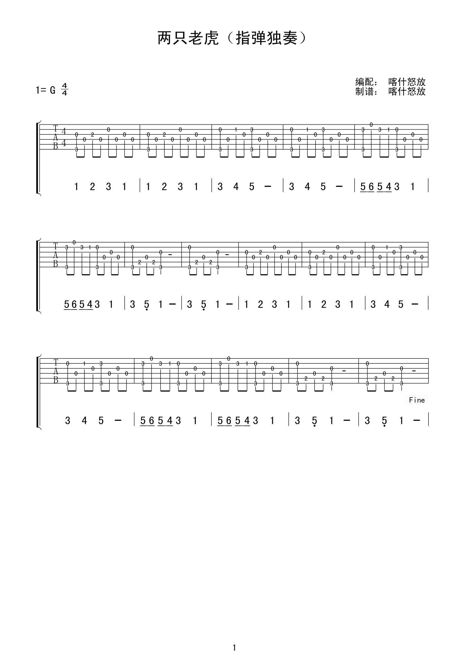儿歌《两只老虎》吉他谱,喀什怒放编配出品,共有1张高清图谱,免翻页排版设计。...