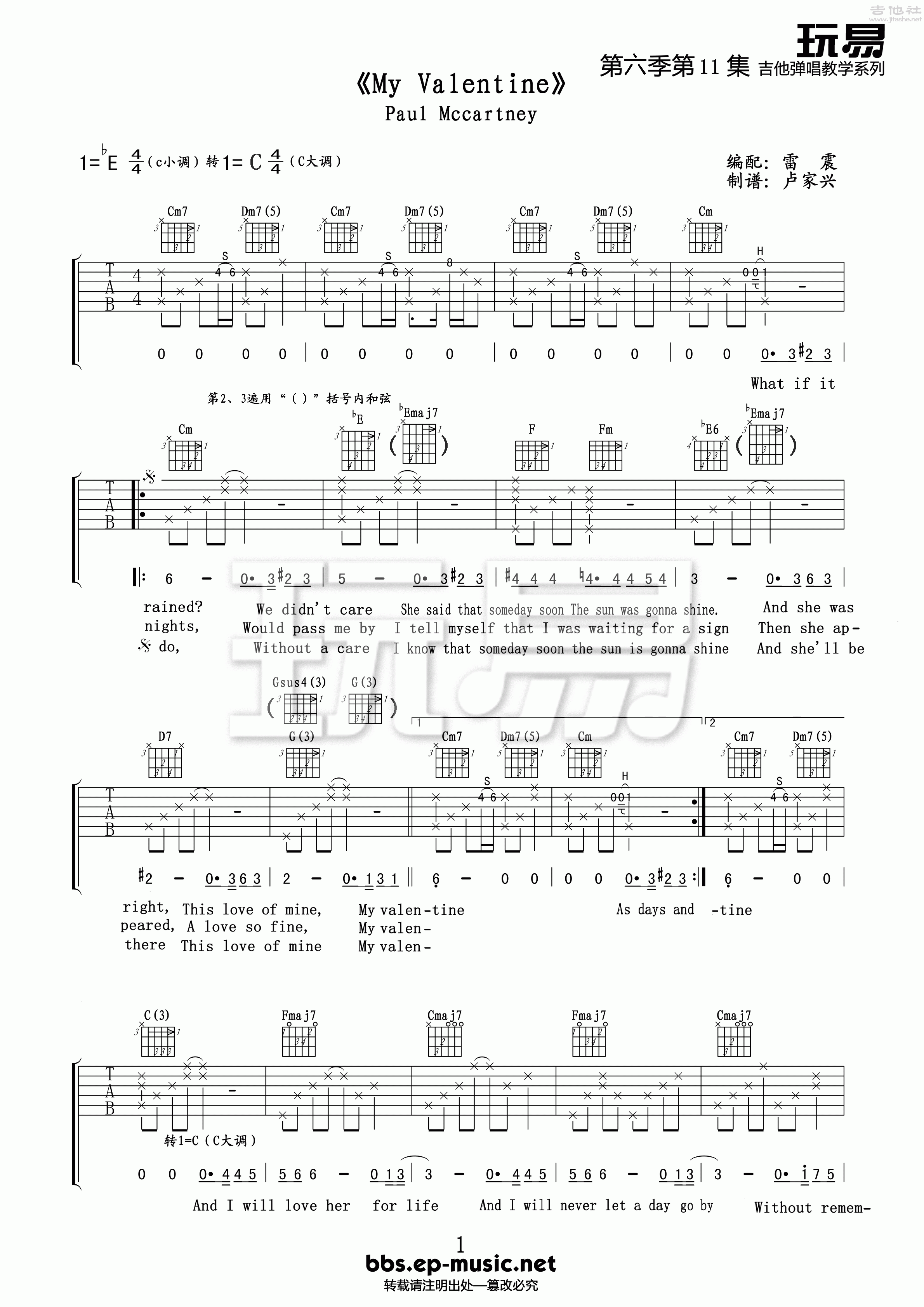 PaulMcCartney《MyValentine》吉他谱,玩易编配出品,共有2张高清图谱,免翻页排版设计。...