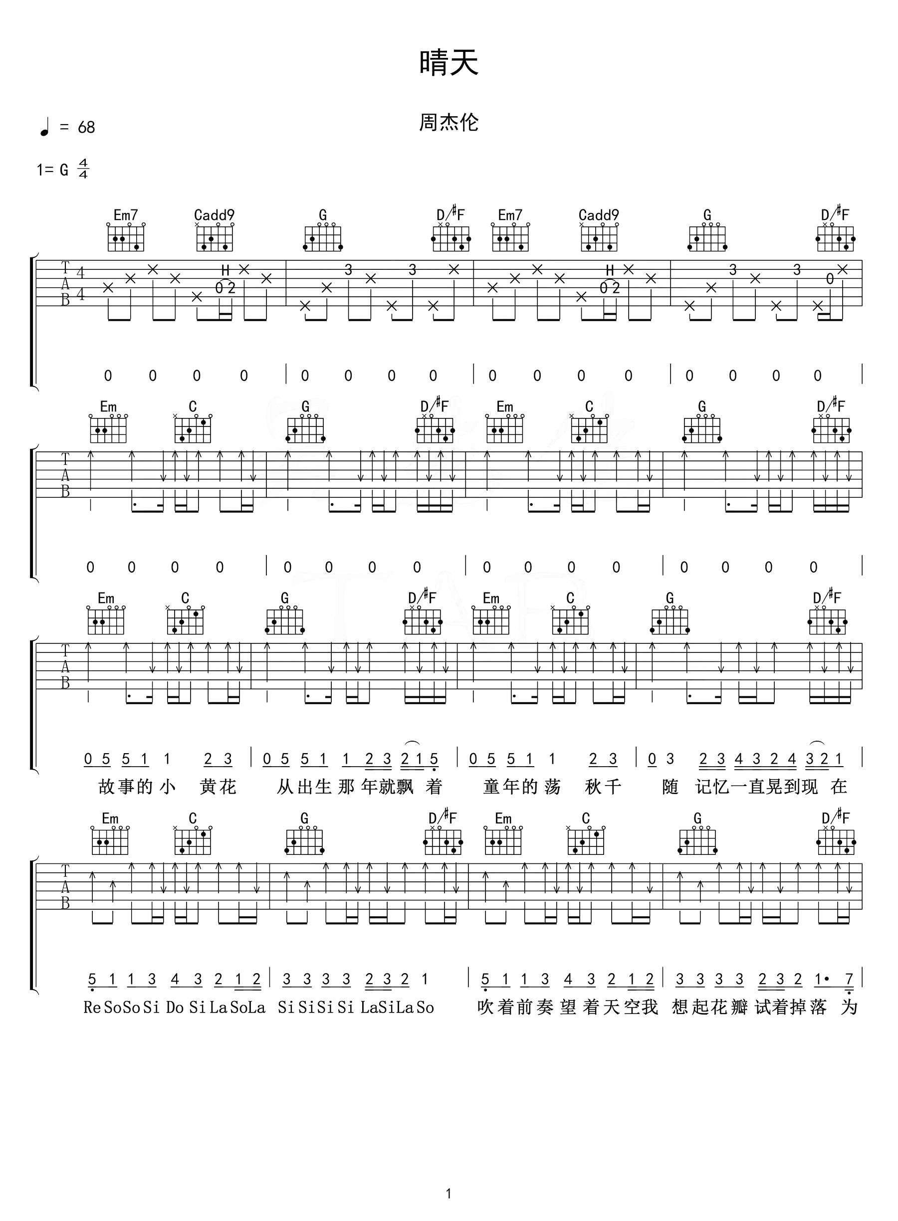 吉他周杰伦《晴天》吉他谱