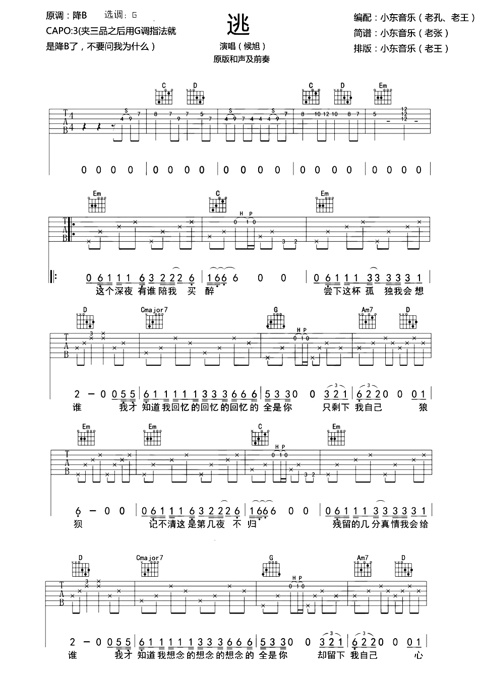 逃吉他谱_侯旭,本曲谱采用G调,夹三品位置,歌曲的速度为70bpm.G调简单原版...