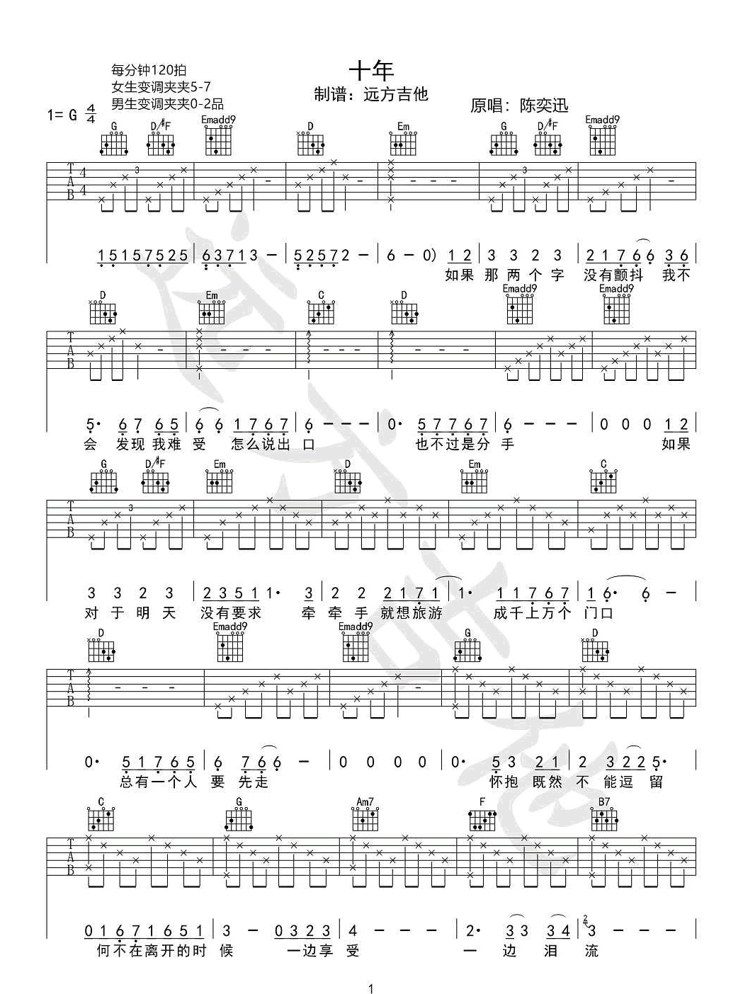 陈奕迅《十年》吉他谱,远方吉他编配出品,共有2张高清图谱,免翻页排版设计。...