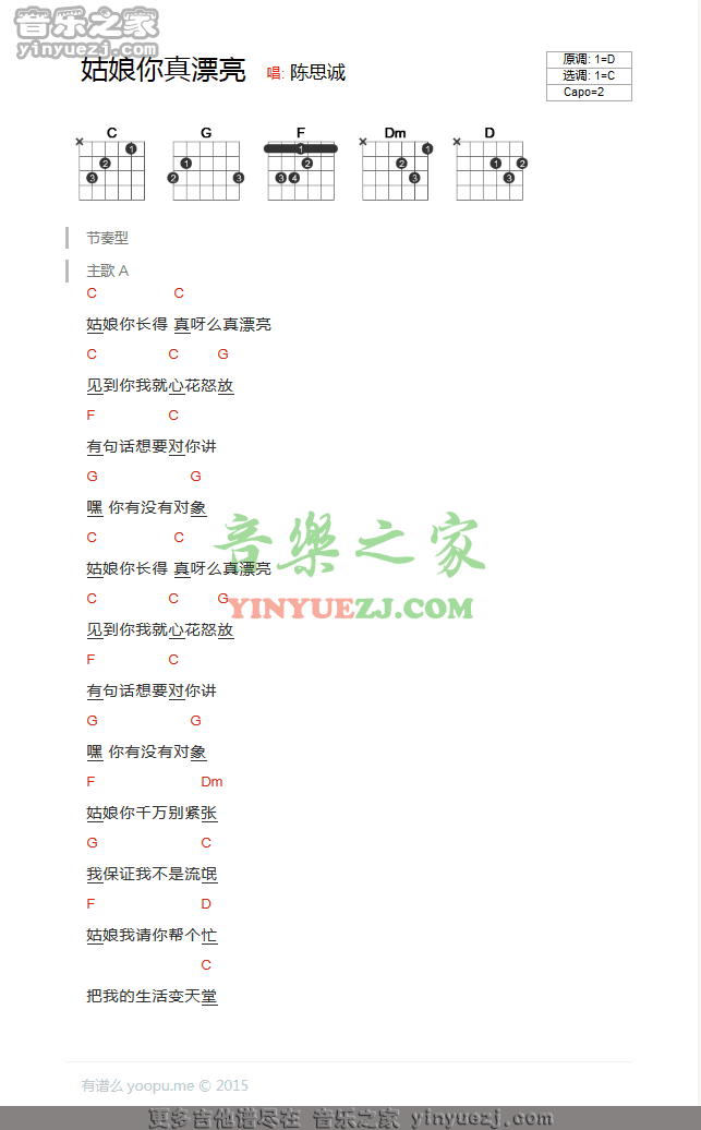 陈思诚《姑娘你长得真漂亮》吉他谱,YYZJ编配出品,共有1张高清图谱,免翻页排版设计。...