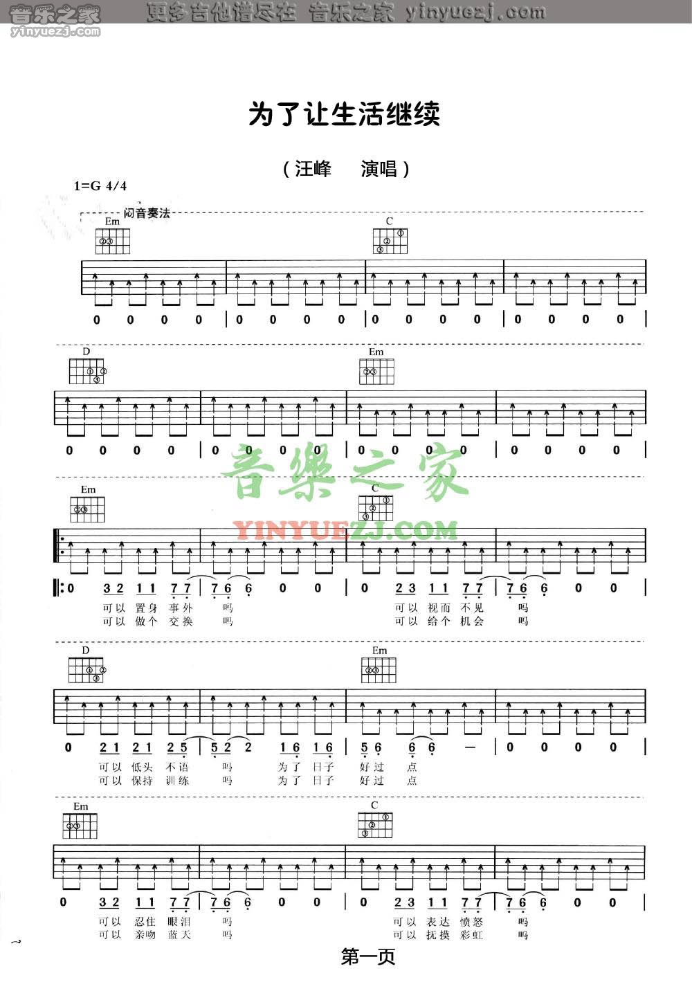 汪峰《为了让生活继续》吉他谱,YYZJ编配出品,共有2张高清图谱,免翻页排版设计。...