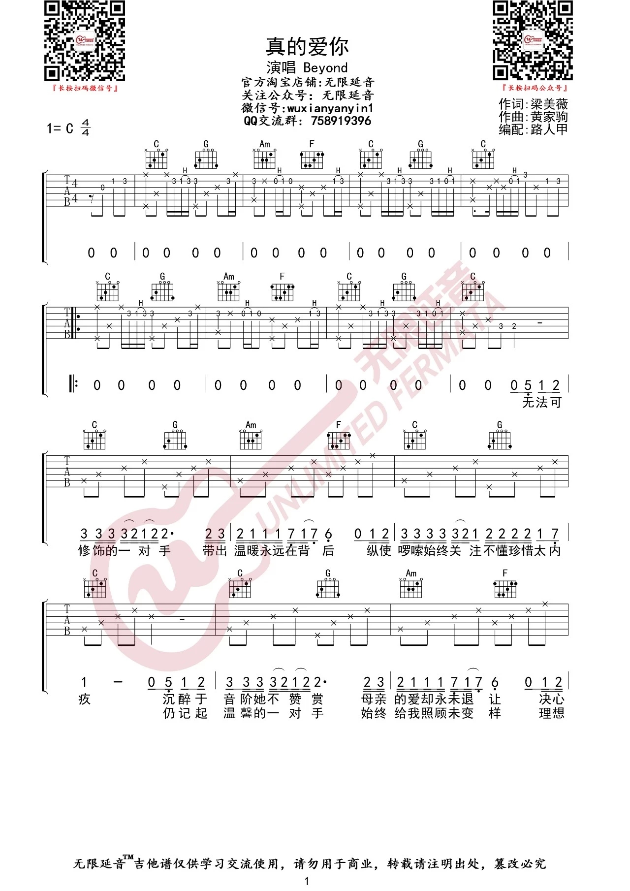 beyond《真的爱你》吉他谱,无限延音编配出品,共有2张高清图谱,免翻页排版设计。...