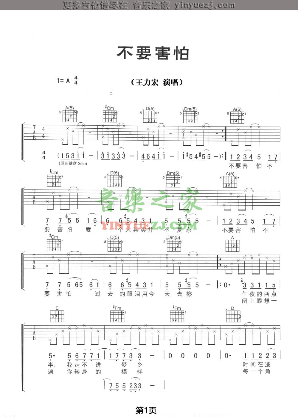 王力宏《不要害怕》吉他谱,YYZJ编配出品,共有3张高清图谱。...