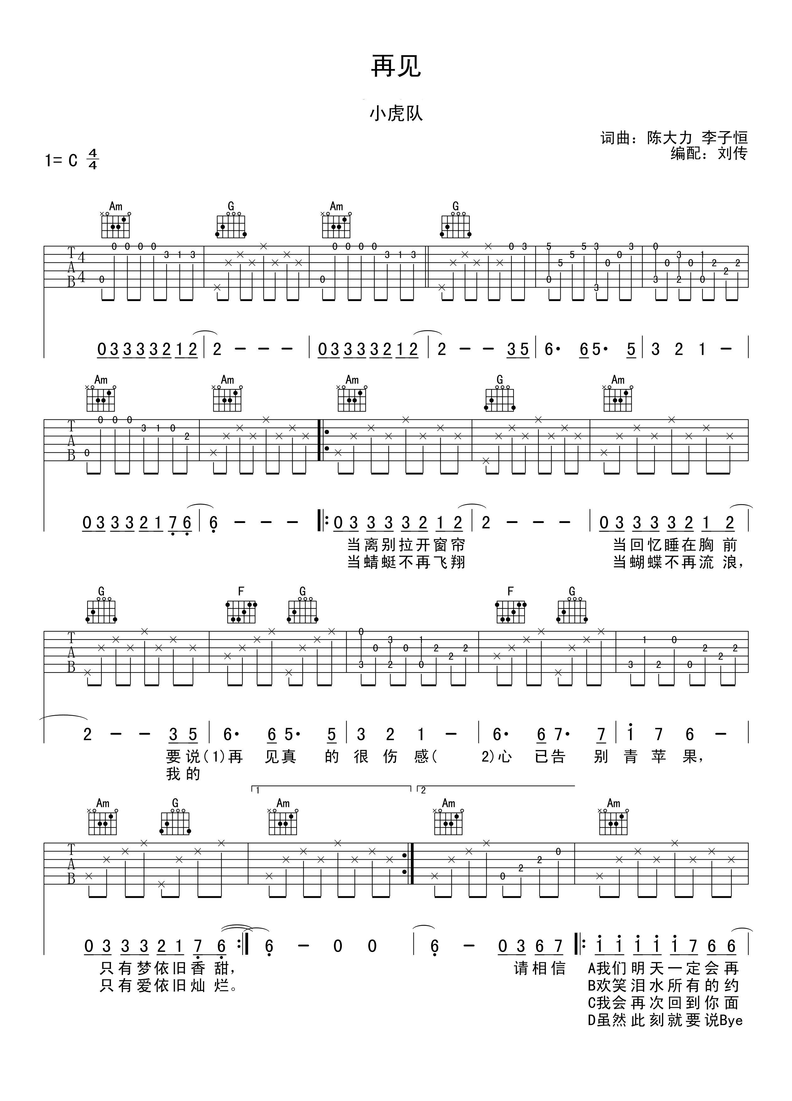 小虎队《再见》吉他谱,共有2张高清图谱,免翻页排版设计。...
