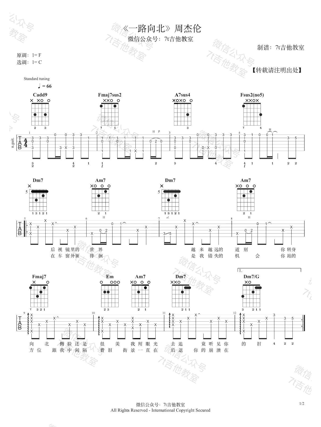 周杰伦《一路向北》吉他谱,共有2张高清图谱,免翻页排版设计。...