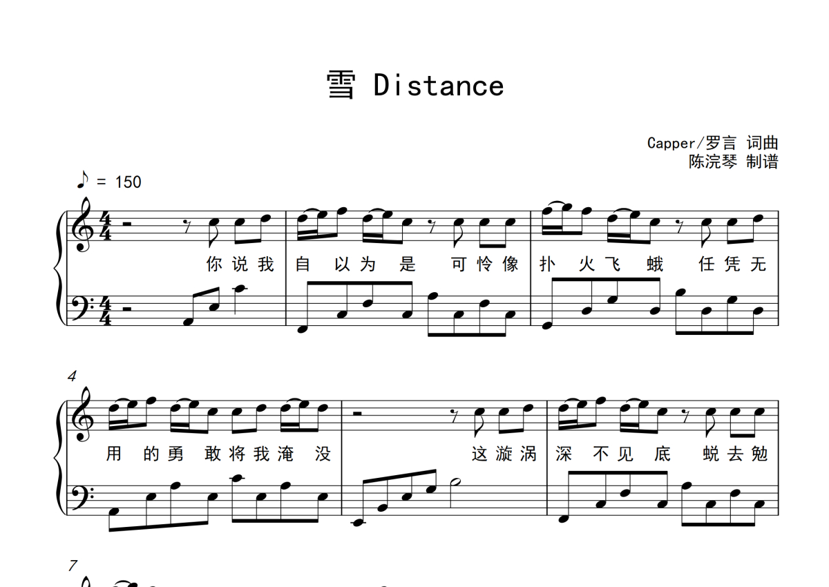 Capper/罗言RollFlash《雪Distance》钢琴谱,月隐云先知编配出品,共有1张高清图谱,免翻页排版设计。...