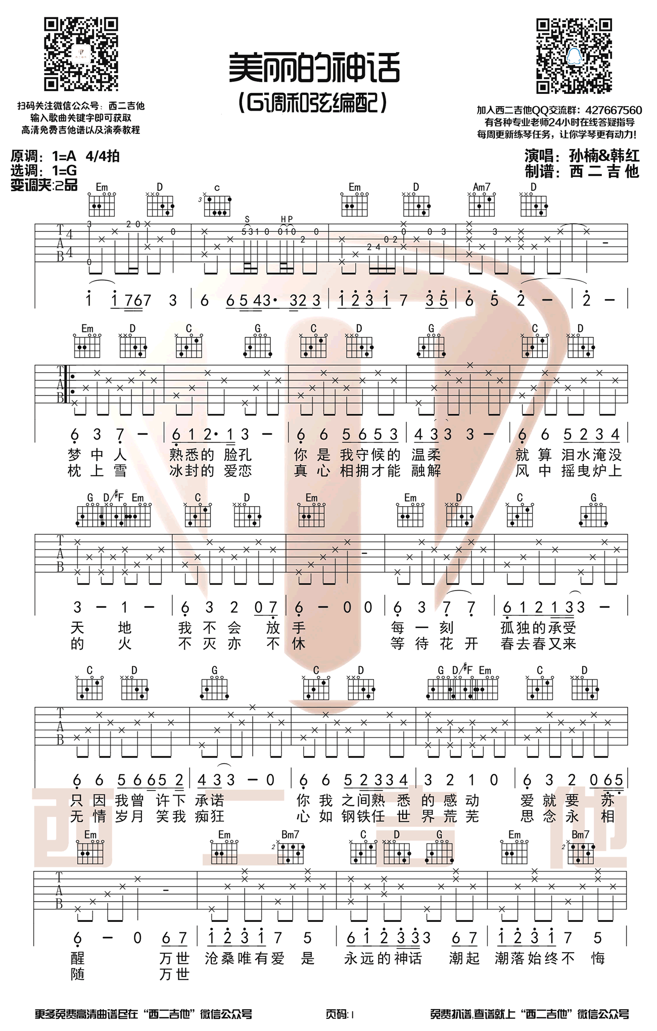 韩红/孙楠《神话》吉他谱,西二吉他编配出品,共有2张高清图谱,免翻页排版设计。...