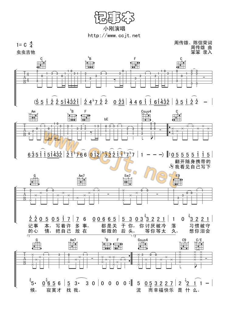 小刚/周传雄《记事本》吉他谱,虫虫吉他编配出品,共有3张高清图谱。...