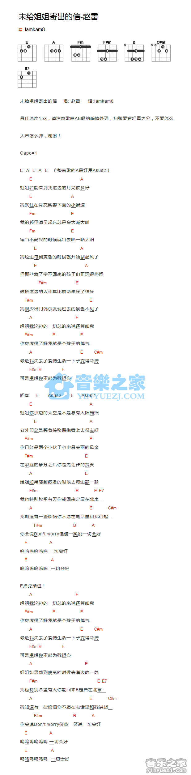 赵雷《未给姐姐寄出的信》吉他谱,YYZJ编配出品,共有1张高清图谱,免翻页排版设计。...