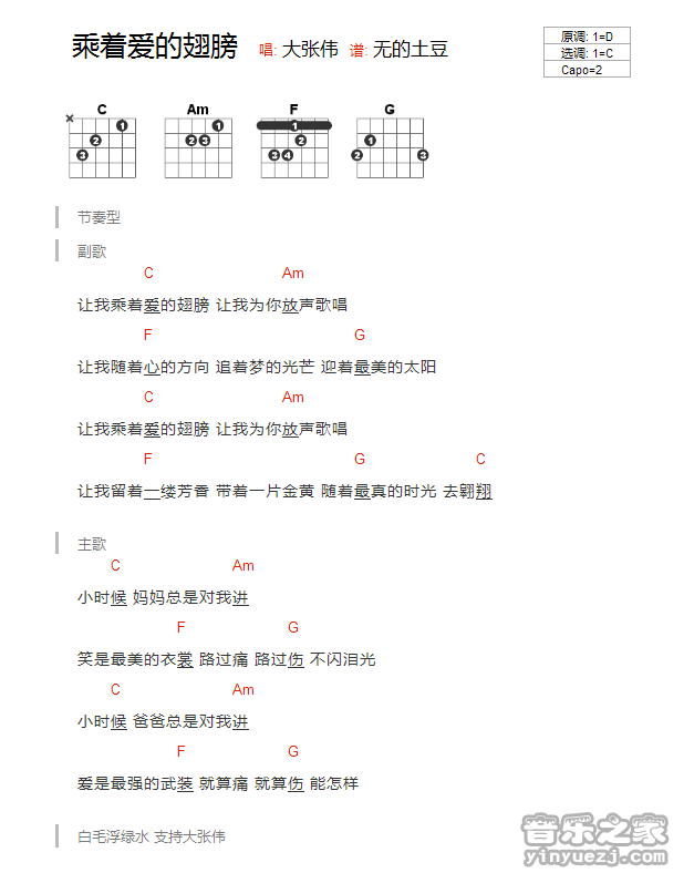 大张伟《乘着爱的翅膀》吉他谱,YYZJ编配出品,共有1张高清图谱,免翻页排版设计。...