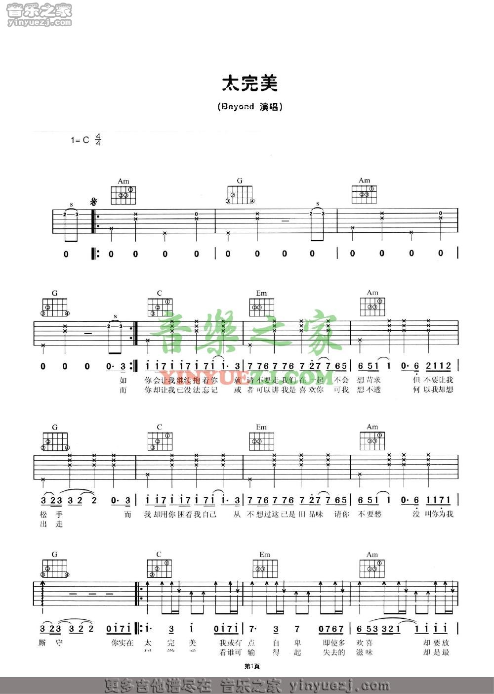 Beyond《太完美》吉他谱,YYZJ编配出品,共有2张高清图谱,免翻页排版设计。...