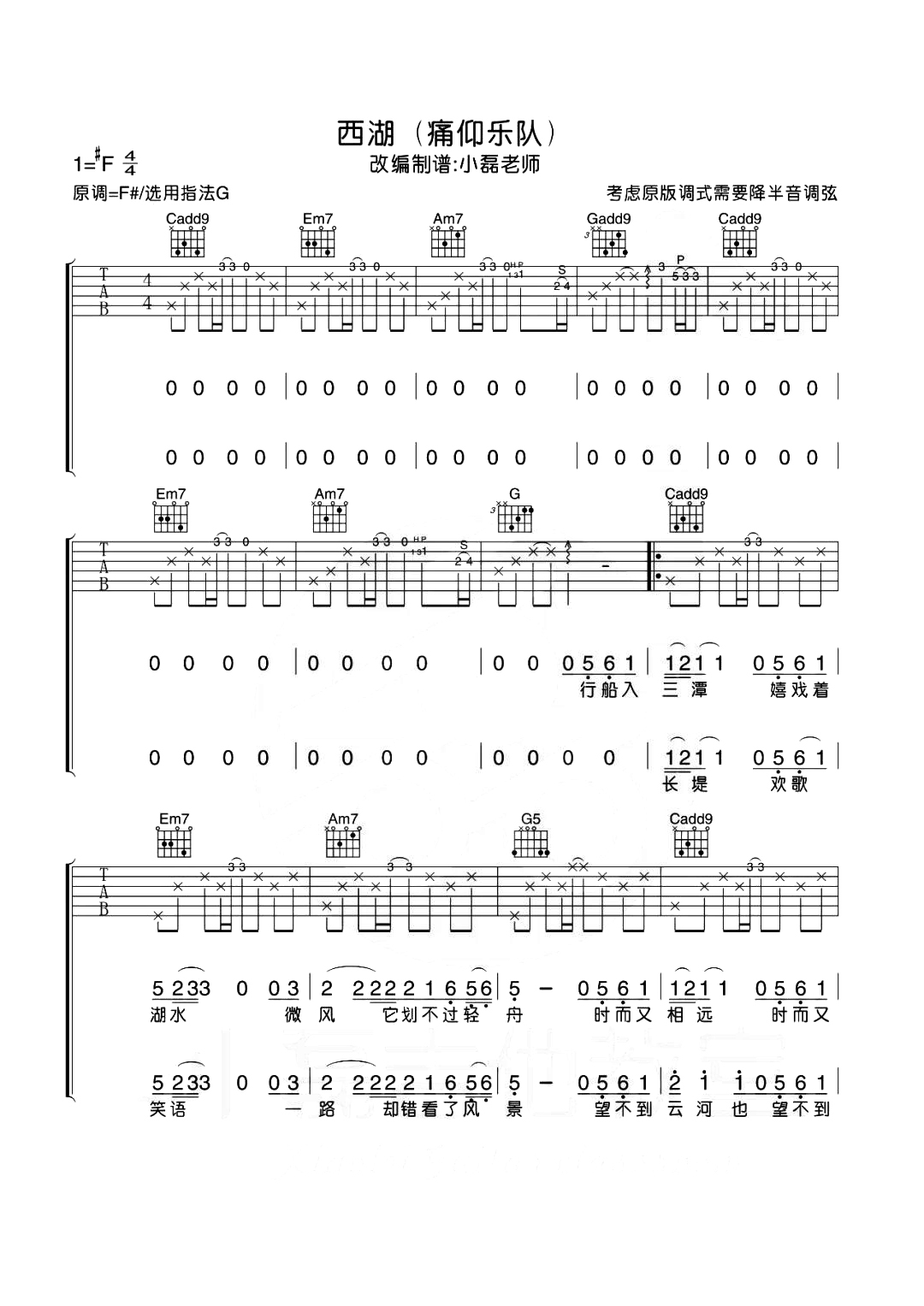 痛仰乐队《西湖》吉他谱,小磊老师编配出品,共有3张高清图谱。...
