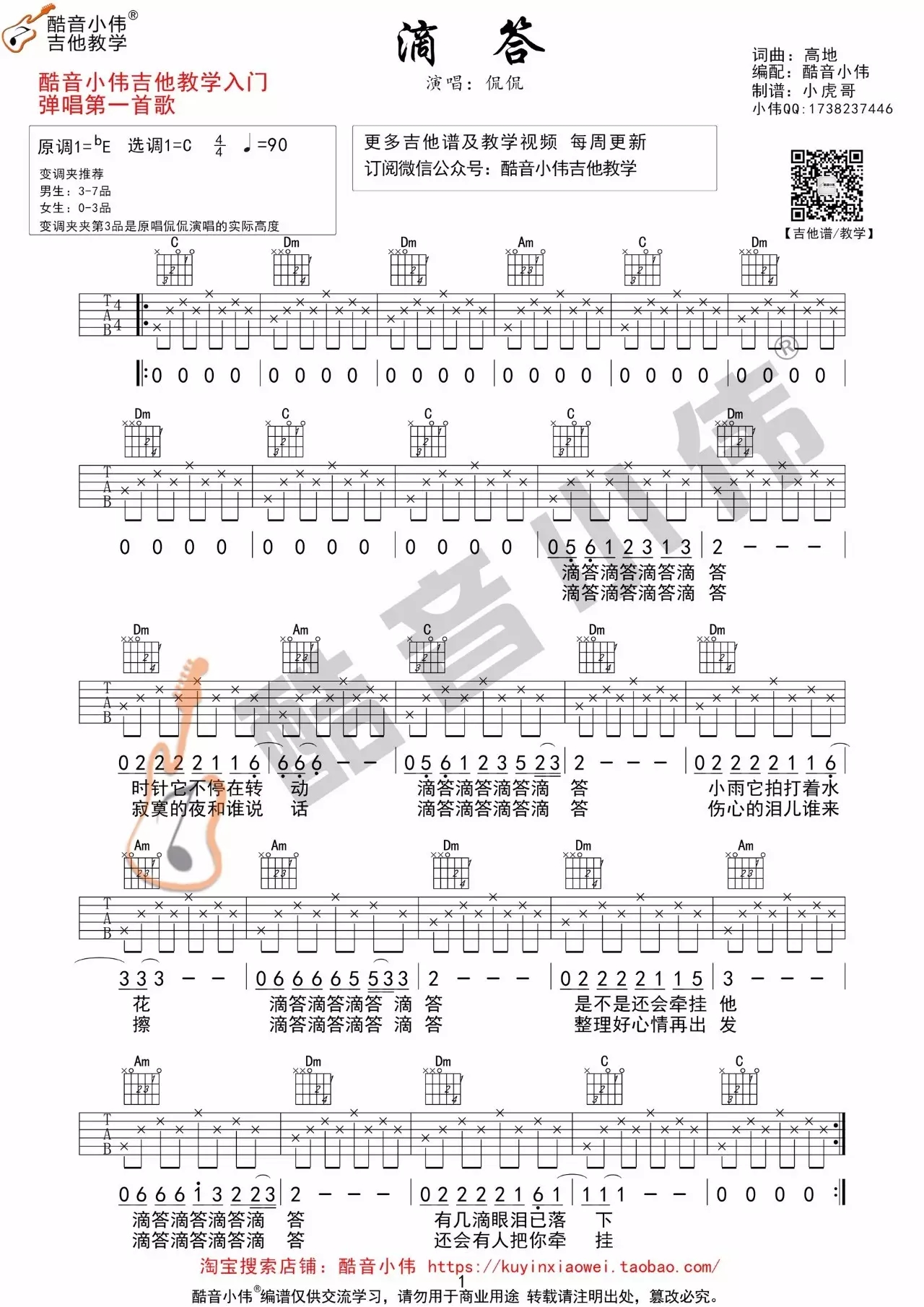 侃侃《滴答》吉他谱,酷音小伟编配出品,共有1张高清图谱,免翻页排版设计。...