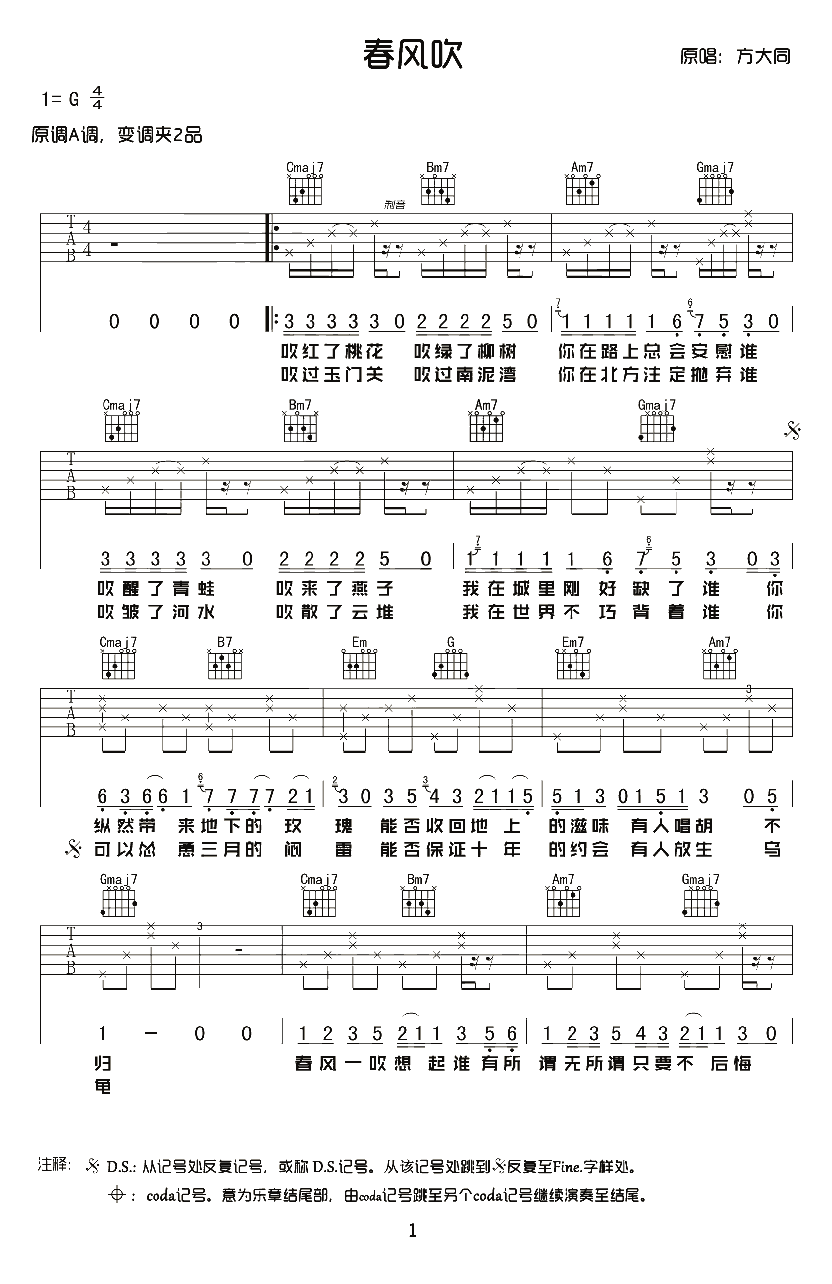 吉他方大同《春风吹》吉他谱 - 唯音悦编配
