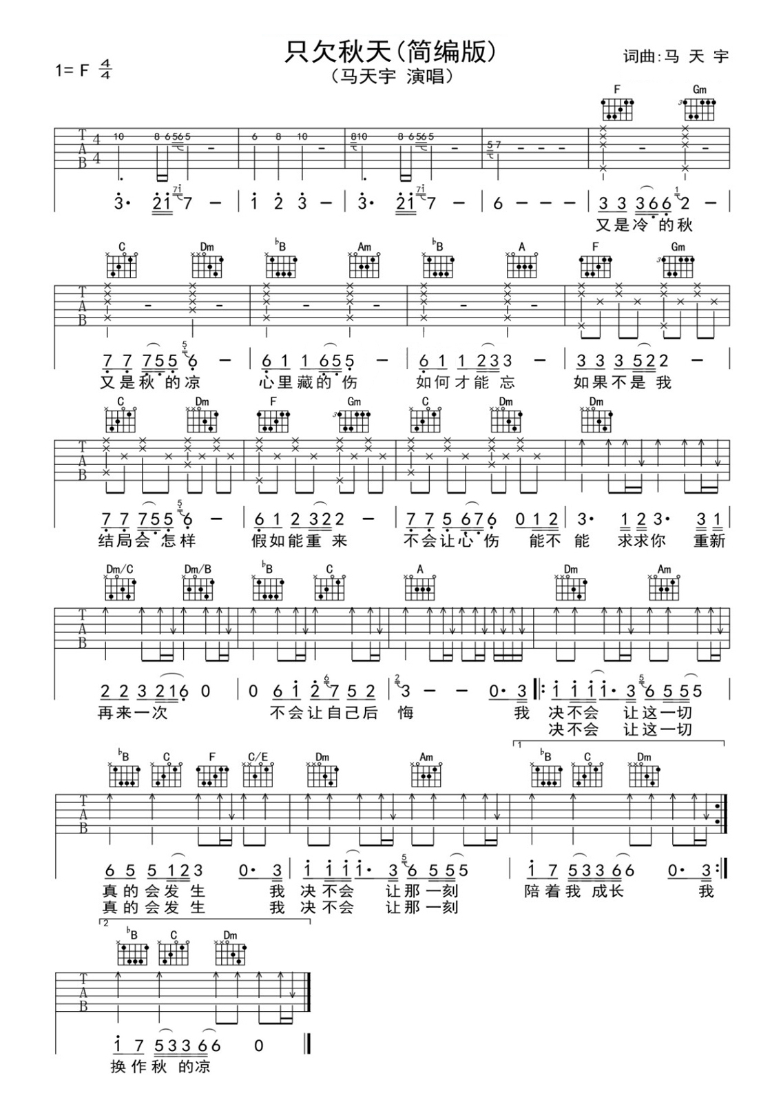 马天宇《只欠秋天》吉他谱,果木音乐编配出品,共有1张高清图谱,免翻页排版设计。...