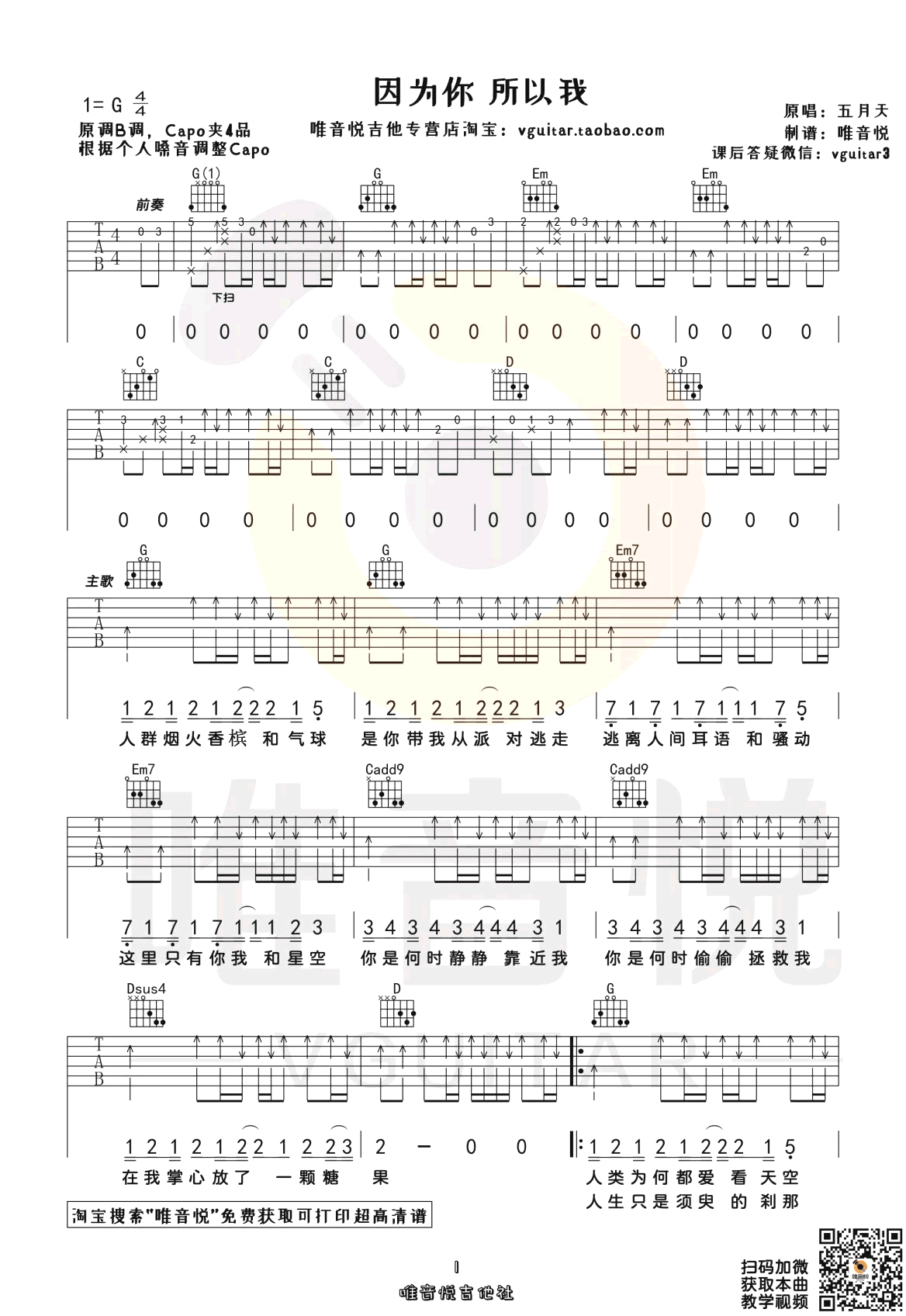 吉他五月天《因为你所以我》吉他谱 - 唯音悦编配
