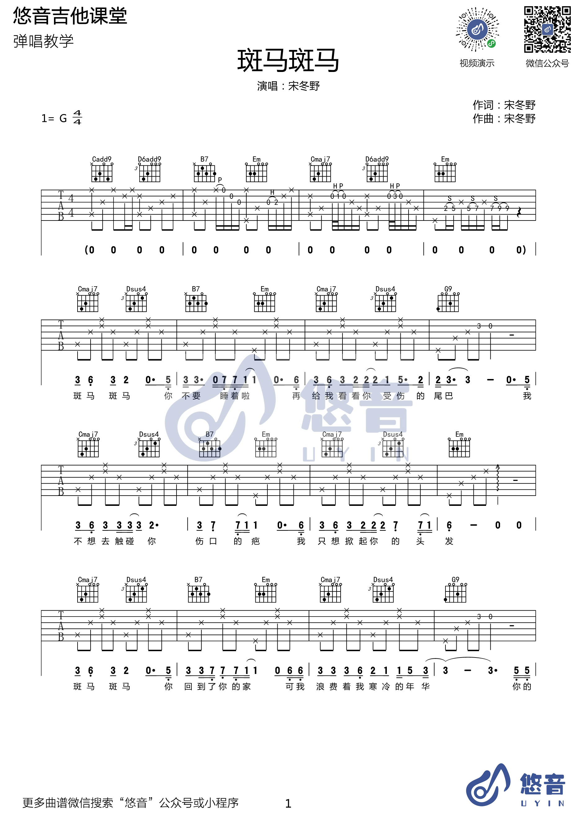 宋冬野《斑马斑马》吉他谱,悠音编配出品,共有3张高清图谱。...