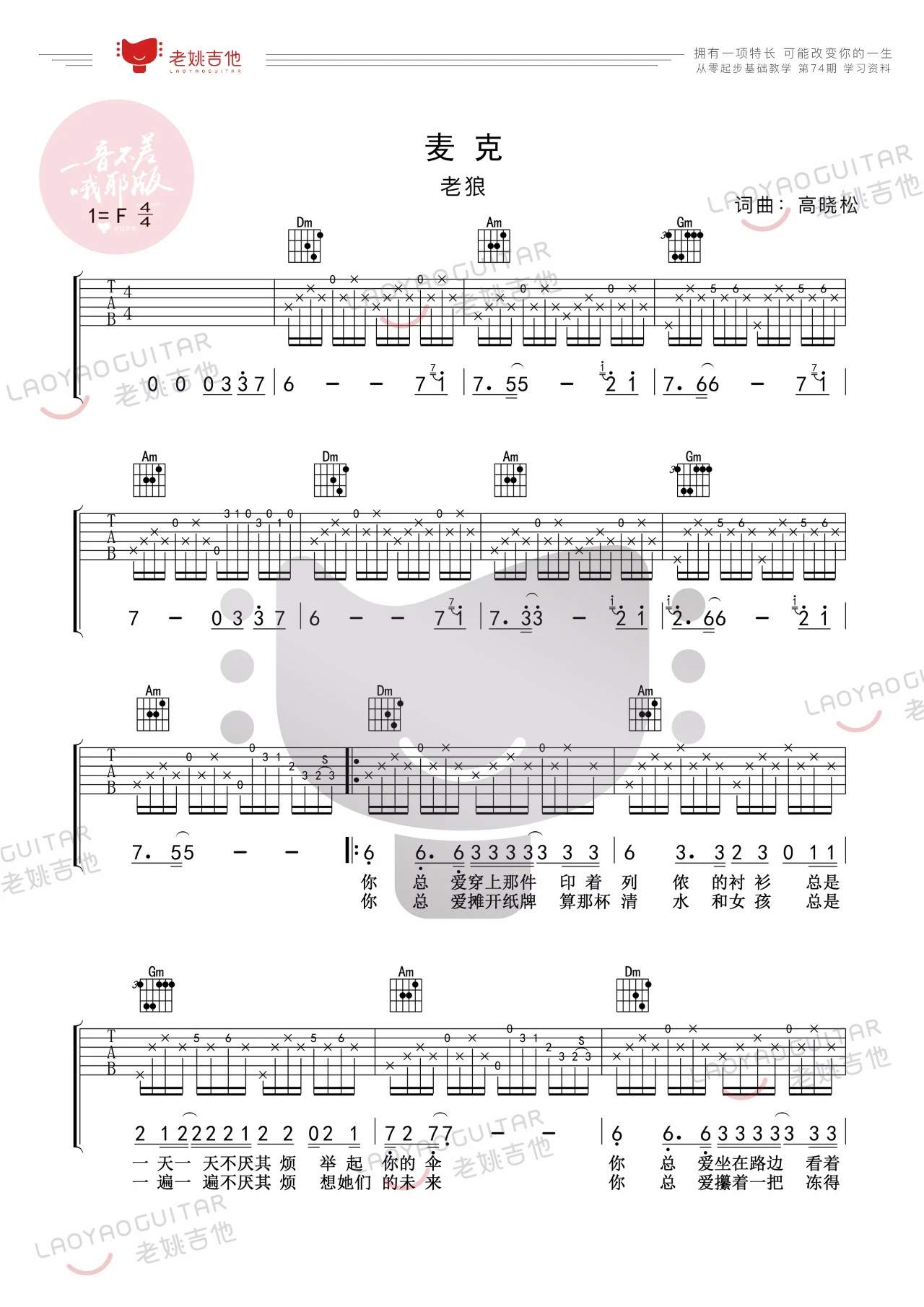 老狼《麦克》吉他谱,老姚吉他编配出品,共有3张高清图谱。...