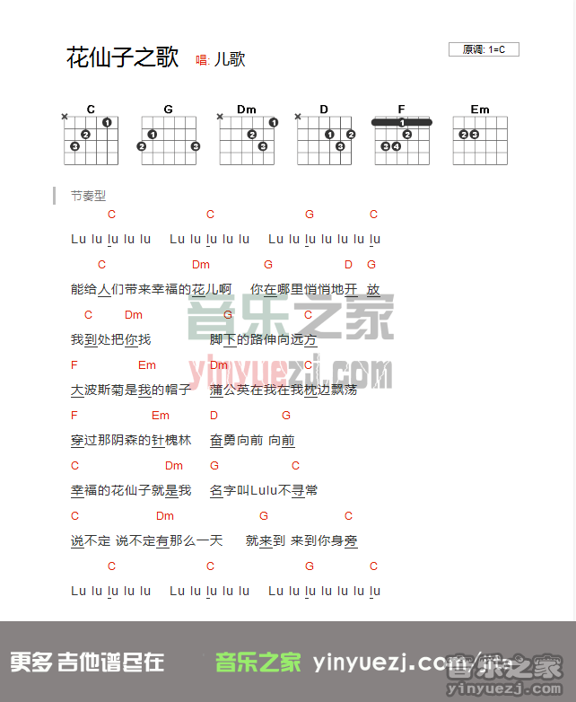 儿歌《花仙子之歌》吉他谱,YYZJ编配出品,共有1张高清图谱,免翻页排版设计。...