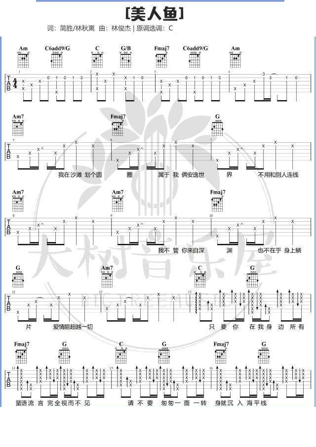 林俊杰《美人鱼》吉他谱,大树音乐屋编配出品,共有3张高清图谱。...