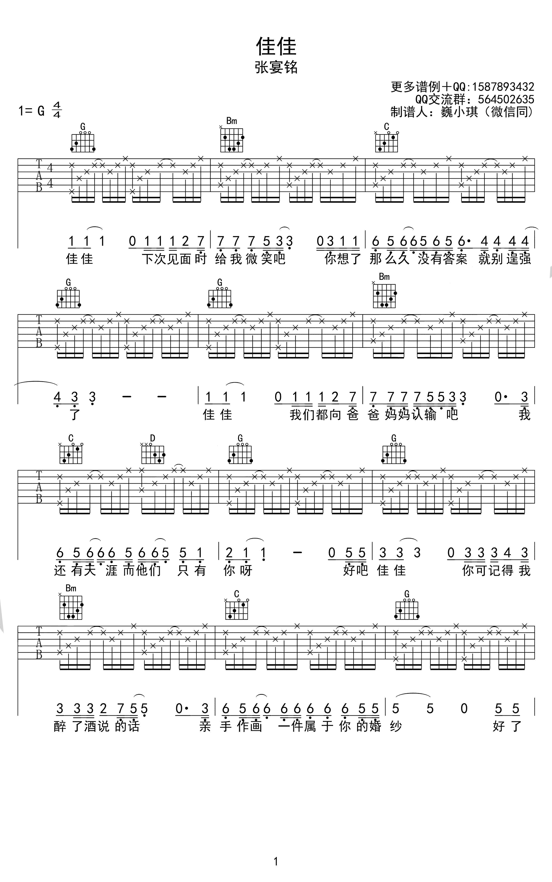 《佳佳》吉他谱,G调弹唱谱,高清图片谱。张宴铭演唱的一首原创歌曲,被感动的不是民谣本身,而是这首歌会有你的故事。那些年没能说出口的分手理由,都被老张写成了歌。一百多个字,没有撕心裂肺的咆哮,没有深夜的痛哭流涕,只有平静到几近理智的劝解和安慰。...