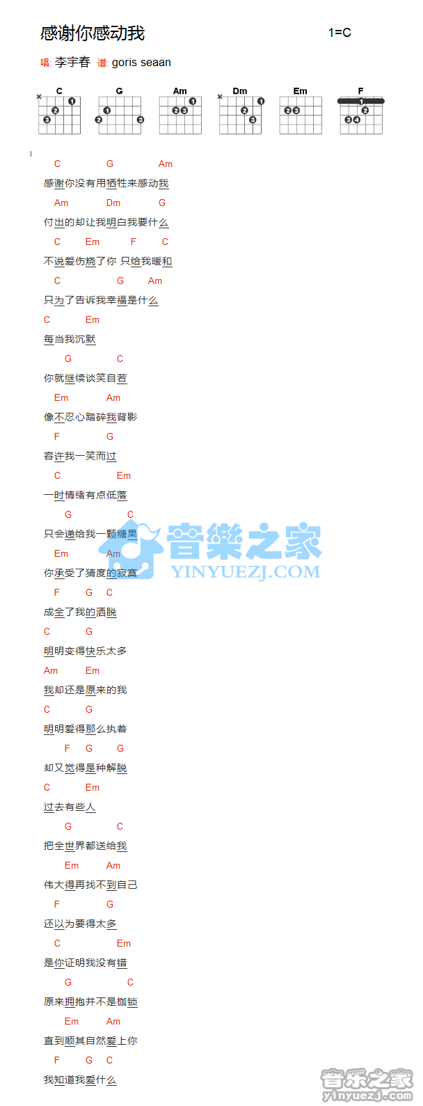 李宇春《感谢你感动我》吉他谱,YYZJ编配出品,共有1张高清图谱,免翻页排版设计。...