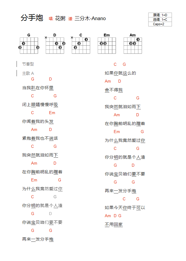 吉他花粥《分手炮》吉他谱 - 很多人都在弹的版本