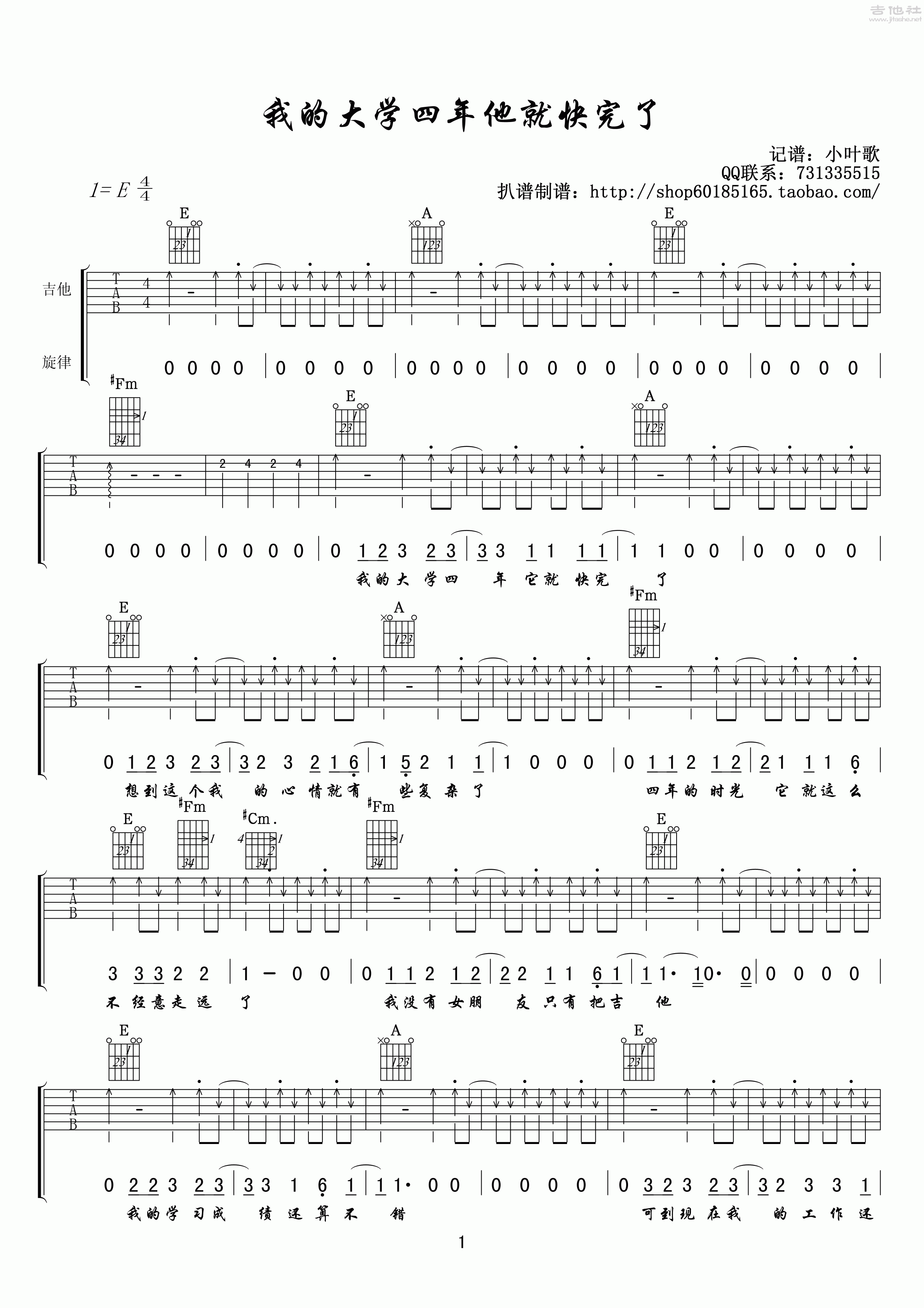 《我的大学四年他就快完了》吉他谱,小叶歌编配出品,共有4张高清图谱。...