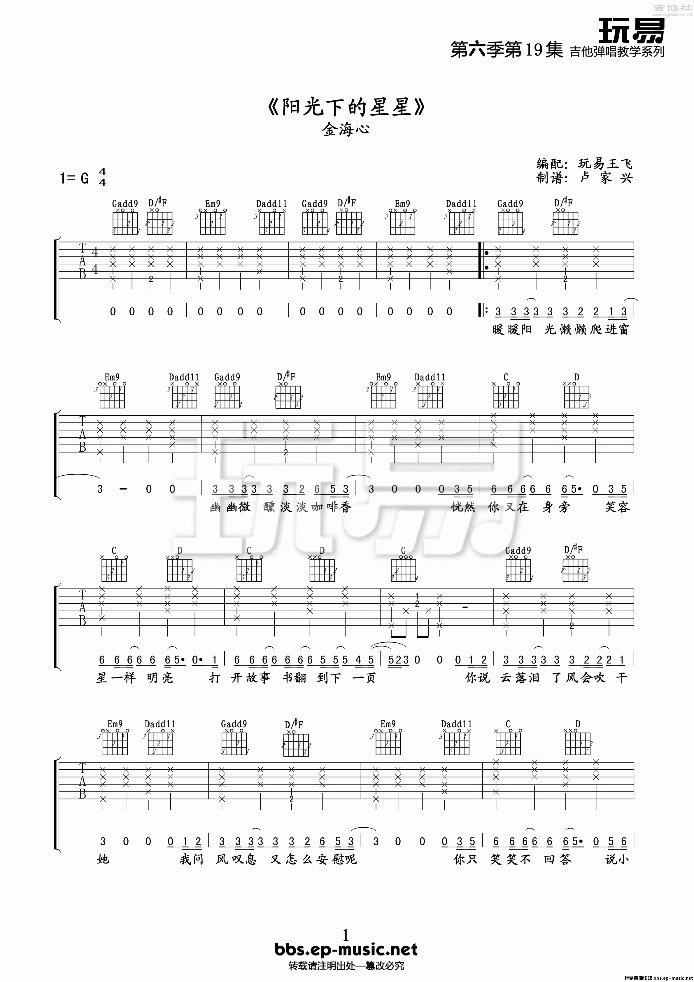 金海心《阳光下的星星》吉他谱,玩易编配出品,共有3张高清图谱。...