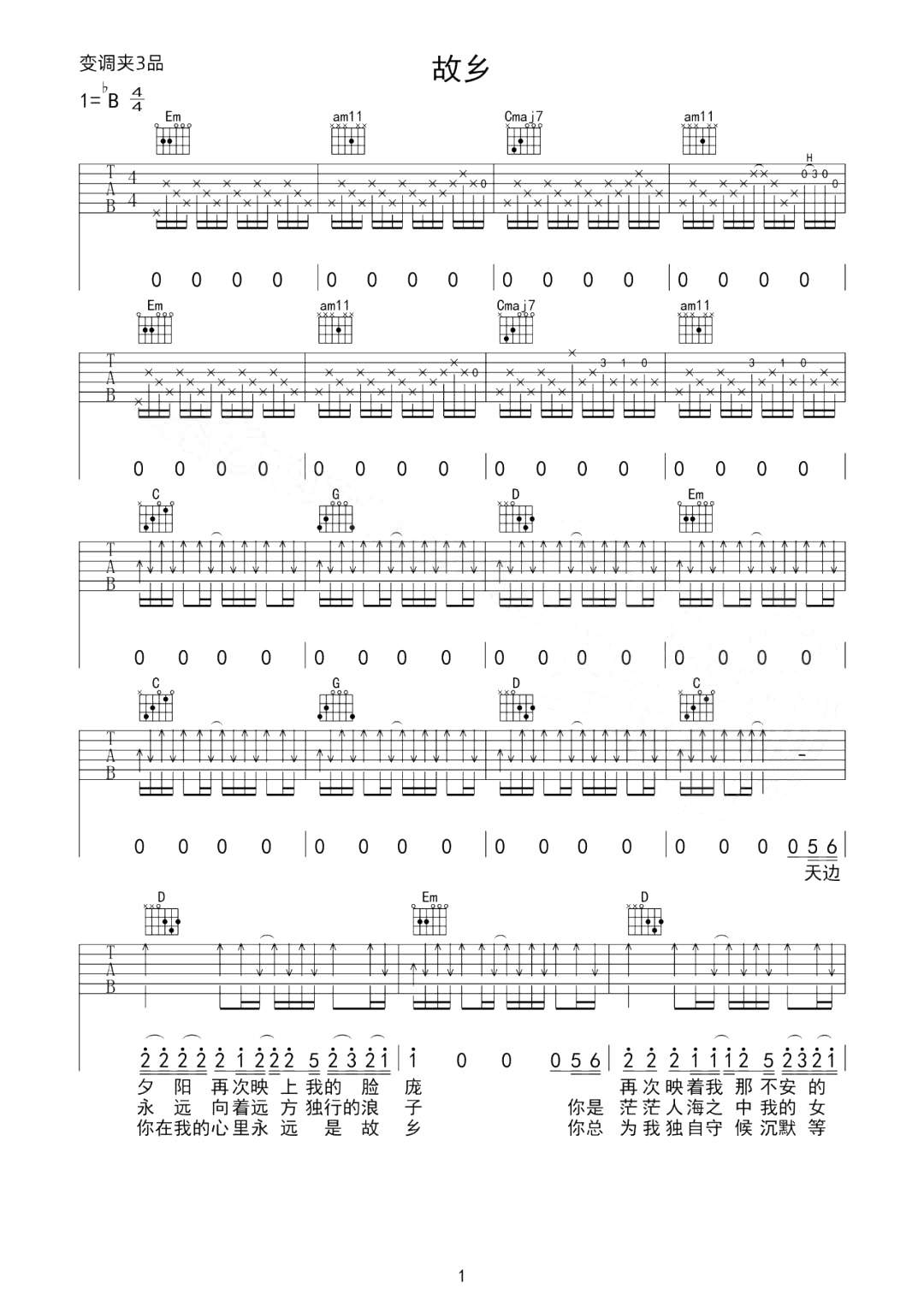 许巍《故乡》吉他谱,革命吉他编配出品,共有3张高清图谱。...
