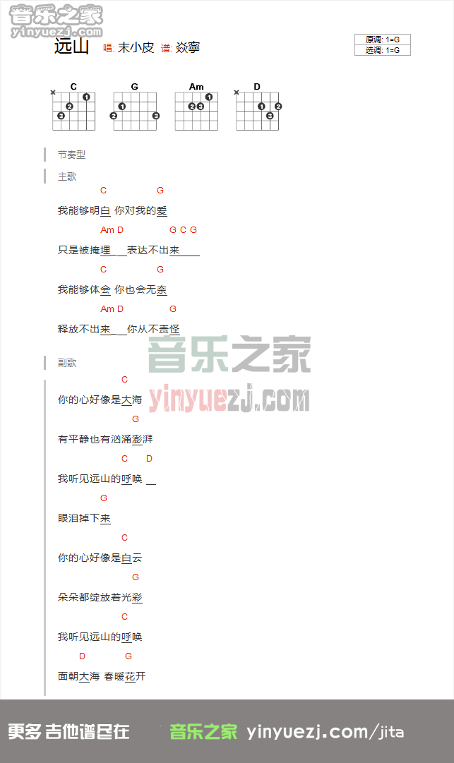末小皮《远山》吉他谱,YYZJ编配出品,共有1张高清图谱,免翻页排版设计。...