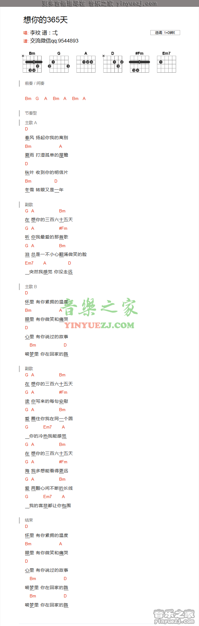 李玟《想你的365天》吉他谱,YYZJ编配出品,共有1张高清图谱,免翻页排版设计。...