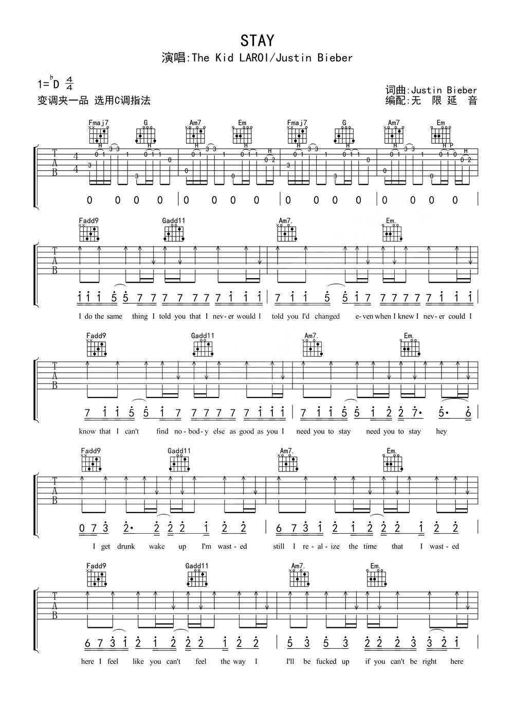 贾斯汀·比伯《Stay》吉他谱,无限延音编配出品,共有3张高清图谱。...
