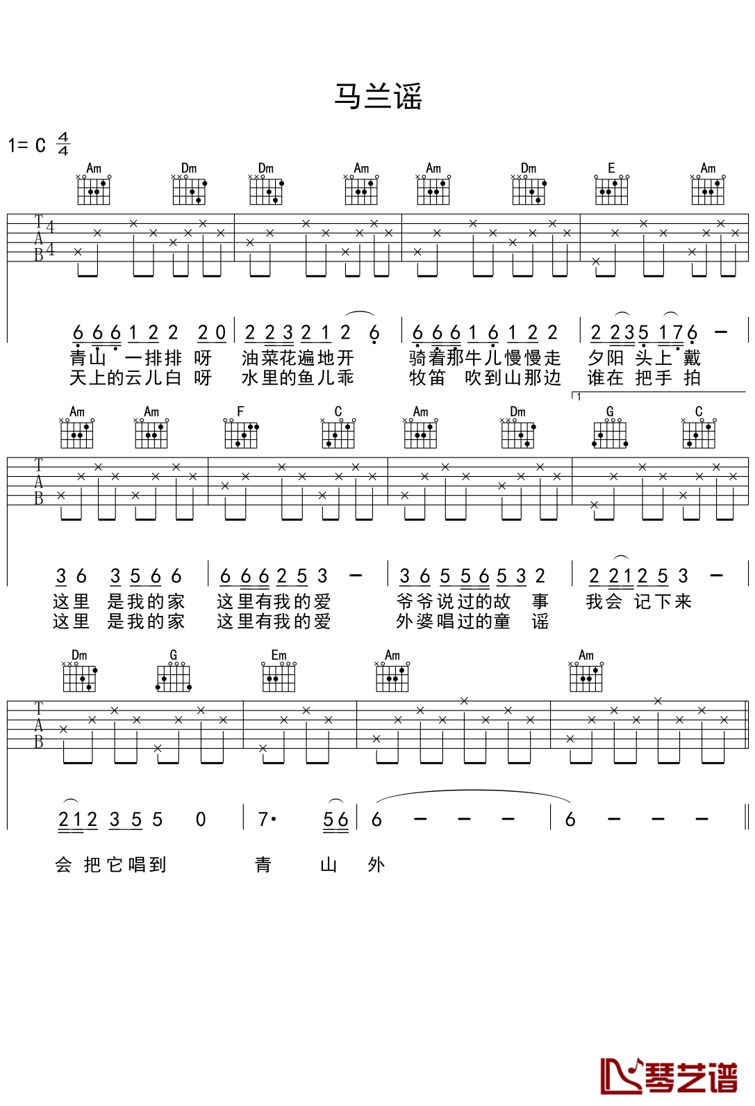 儿歌《马兰谣》吉他谱,共有1张高清图谱,免翻页排版设计。...