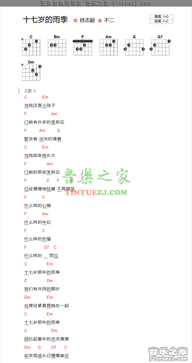 吉他林志颖《十七岁的雨季》吉他谱 - YYZJ编配