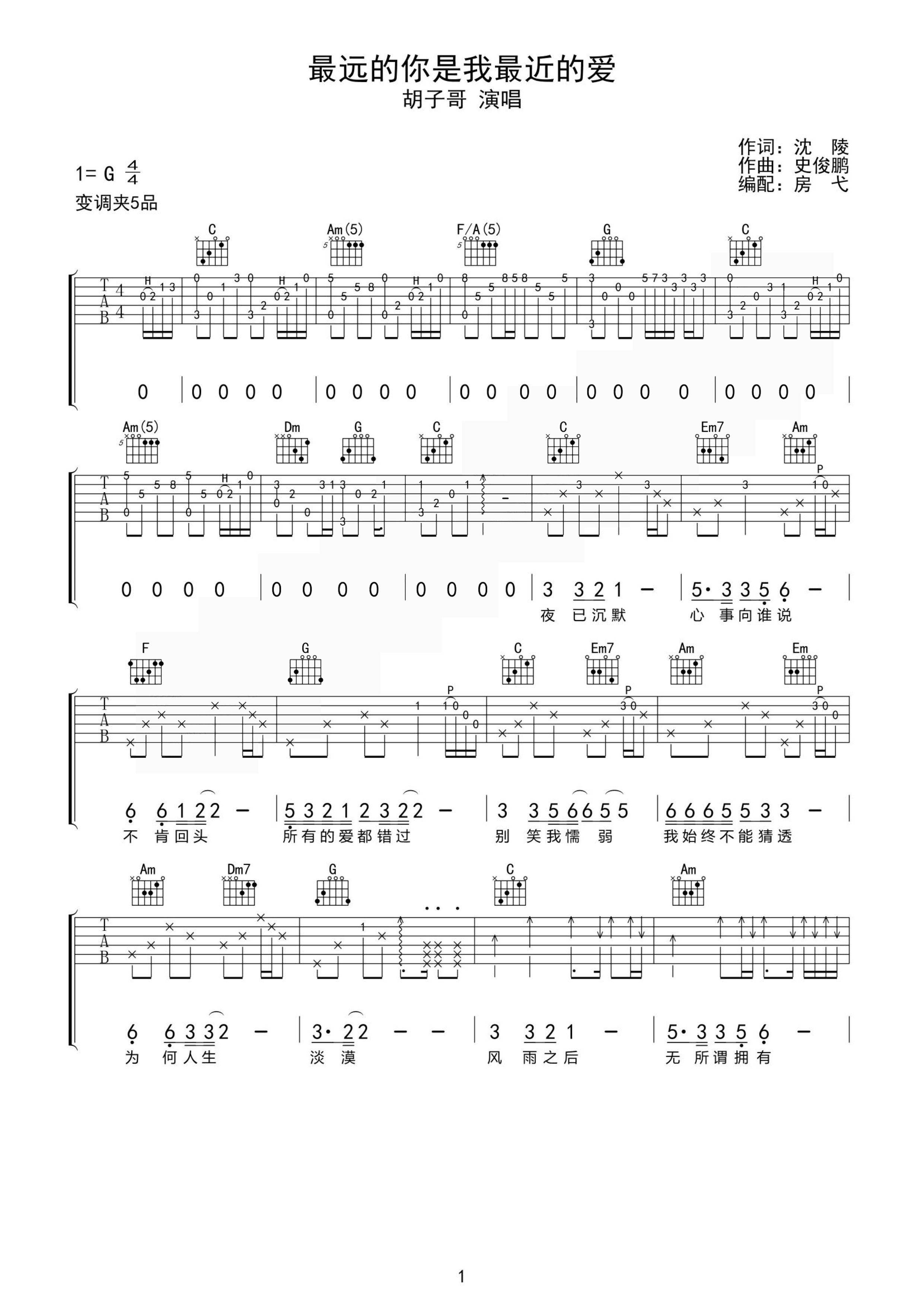 胡子哥《最远的你是我最近的爱》吉他谱,房戈编配出品,共有2张高清图谱,免翻页排版设计。...