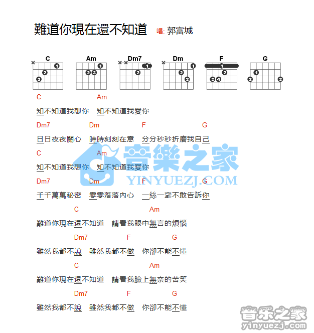 郭富城《难道你现在还不知道》吉他谱,YYZJ编配出品,共有1张高清图谱,免翻页排版设计。...