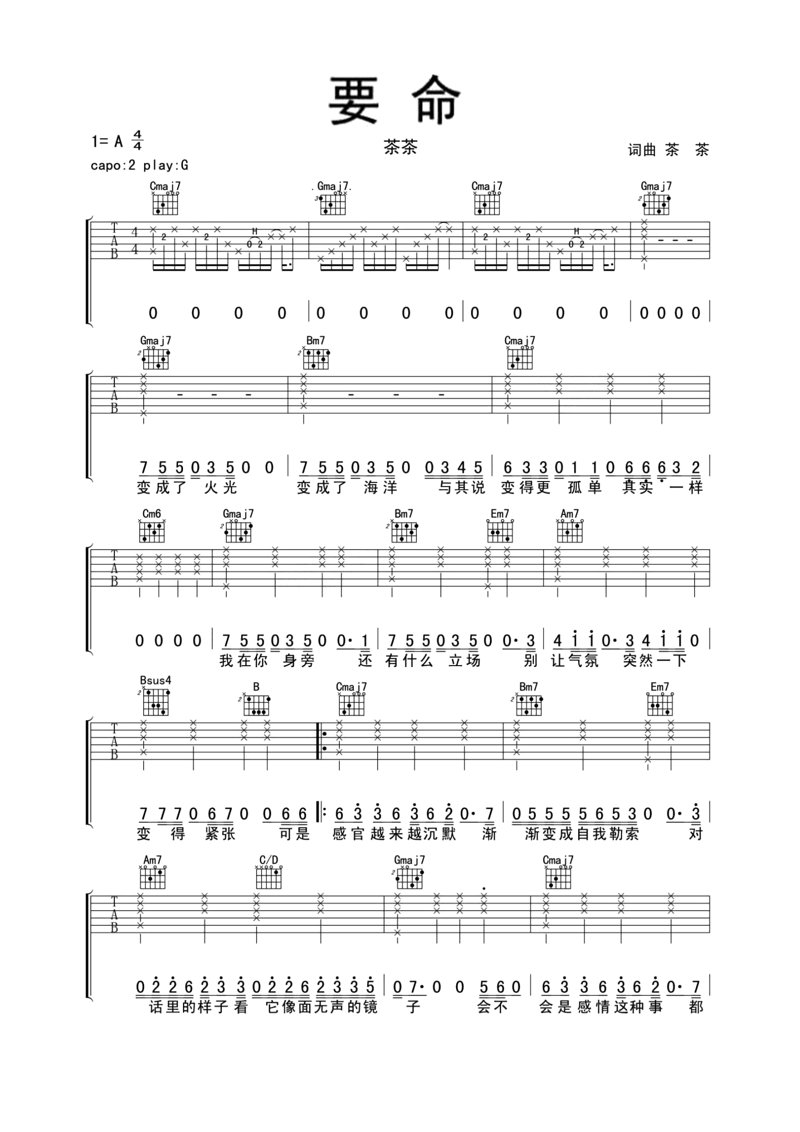 茶茶《要命》吉他谱,JTSJ编配出品,共有2张高清图谱,免翻页排版设计。...