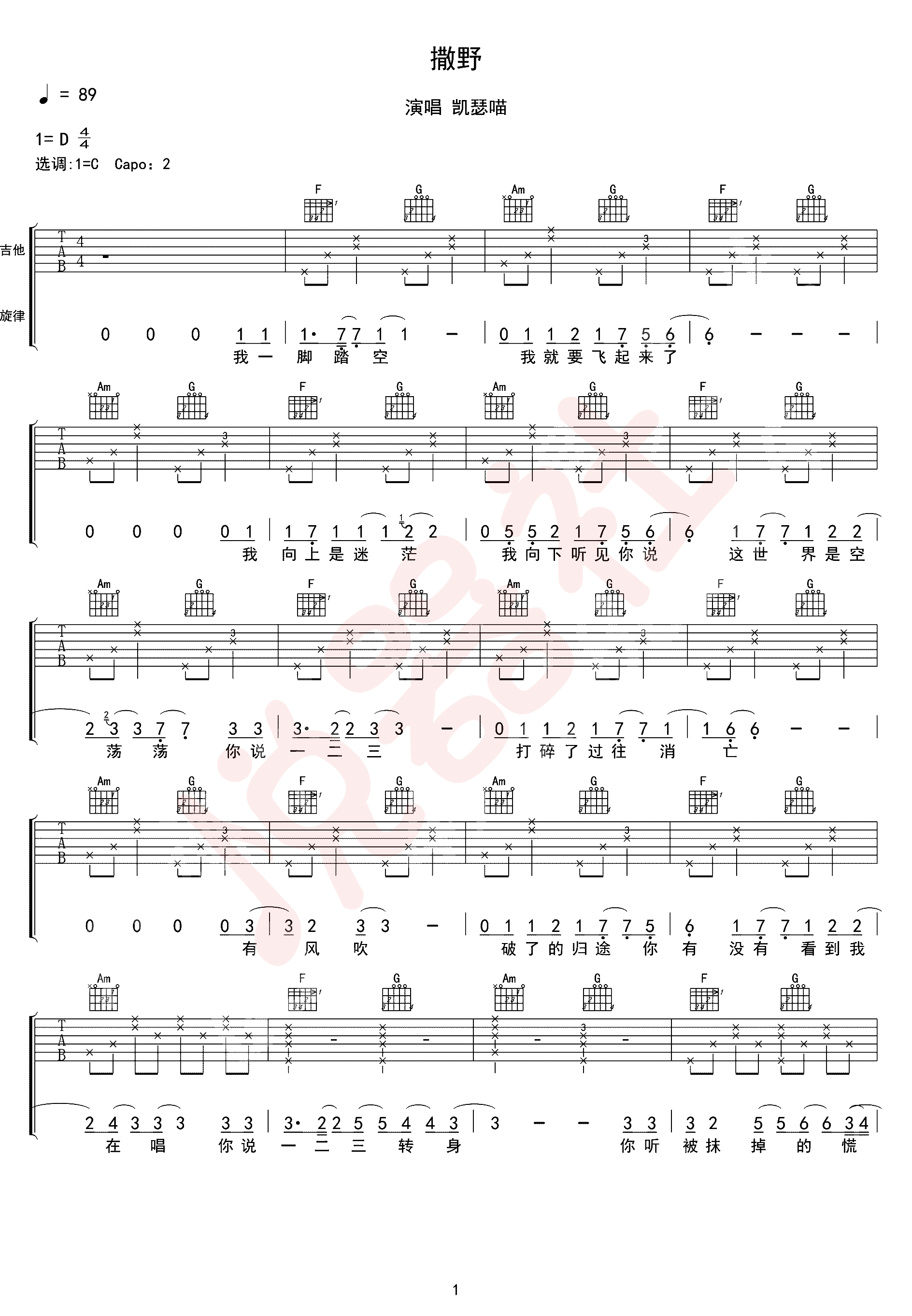 凯瑟喵《撒野》吉他谱,悦器社编配出品,共有3张高清图谱。...