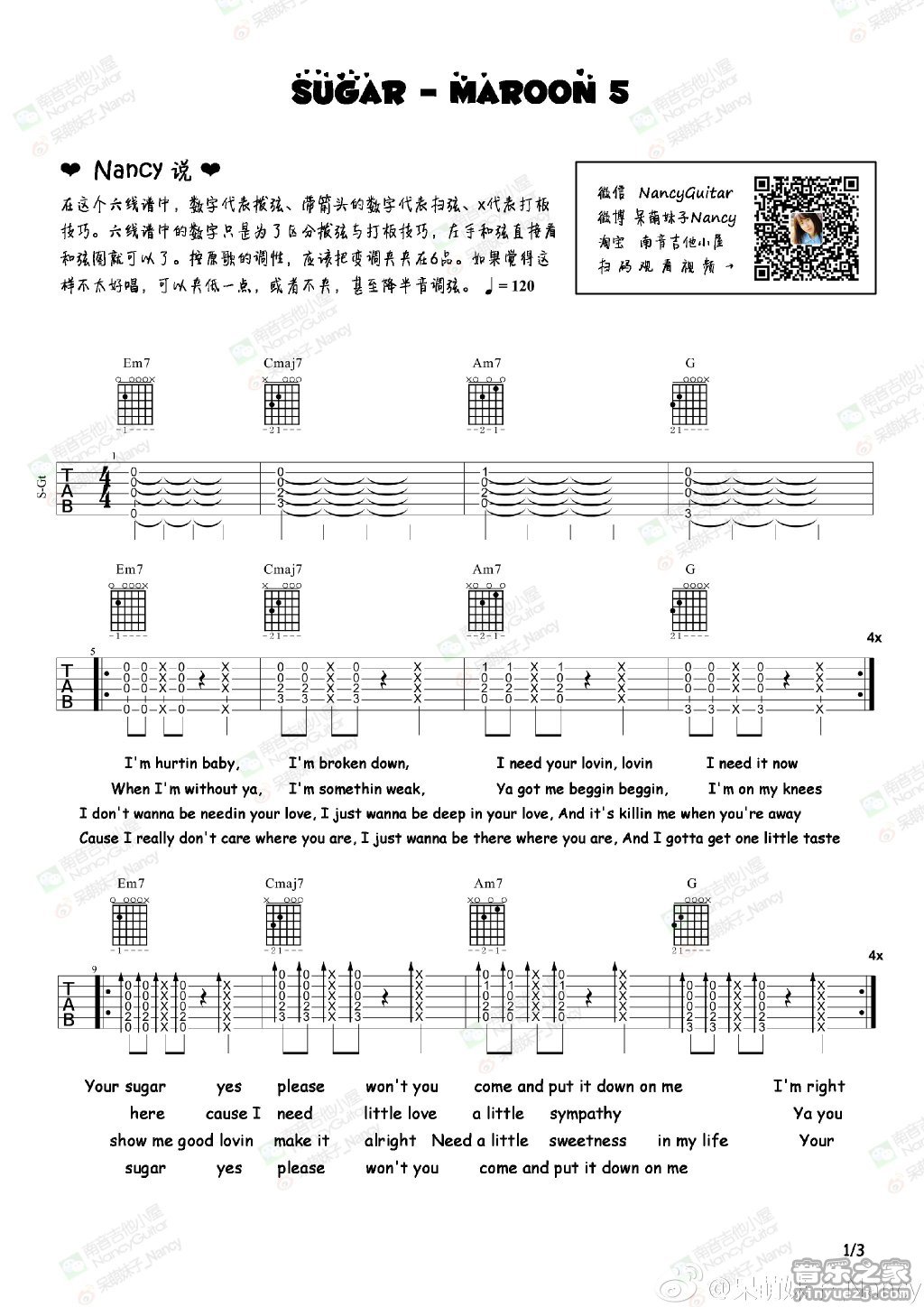 maroon5《sugar》吉他谱,南音吉他编配出品,共有3张高清图谱。...