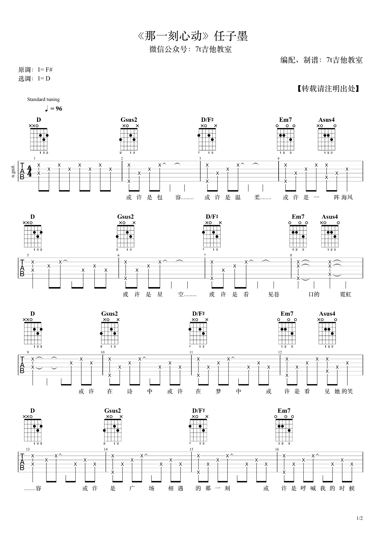 任子墨《那一刻心动》吉他谱,7T吉他教室编配出品,共有2张高清图谱,免翻页排版设计。...