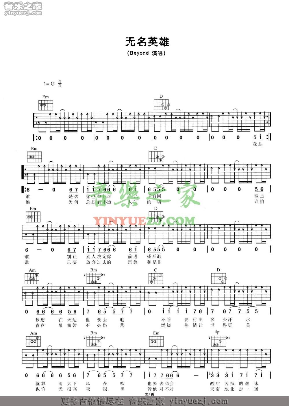 Beyond《无名英雄》吉他谱,YYZJ编配出品,共有2张高清图谱,免翻页排版设计。...