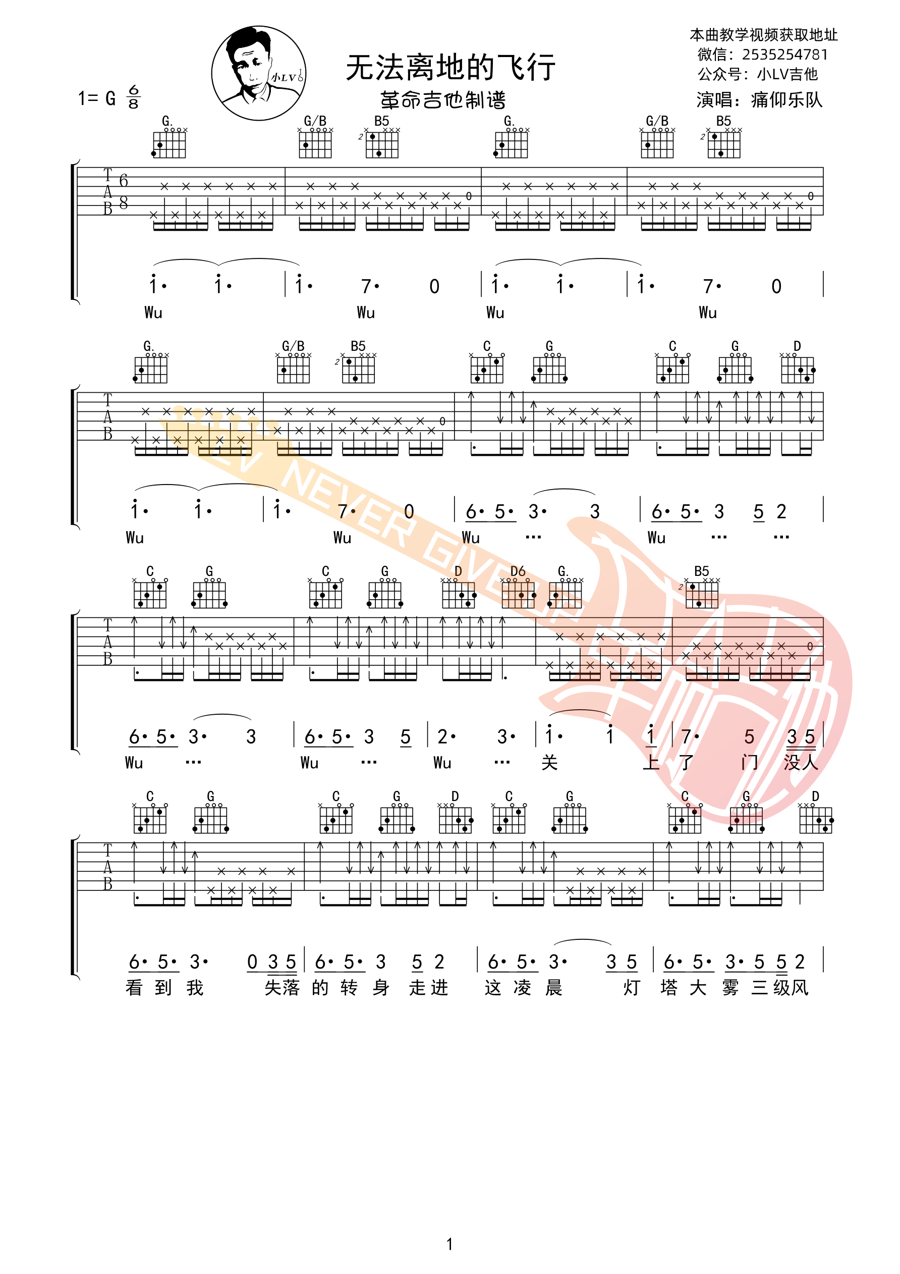 痛仰乐队《无法离地的飞行》吉他谱,革命吉他编配出品,共有5张高清图谱。...