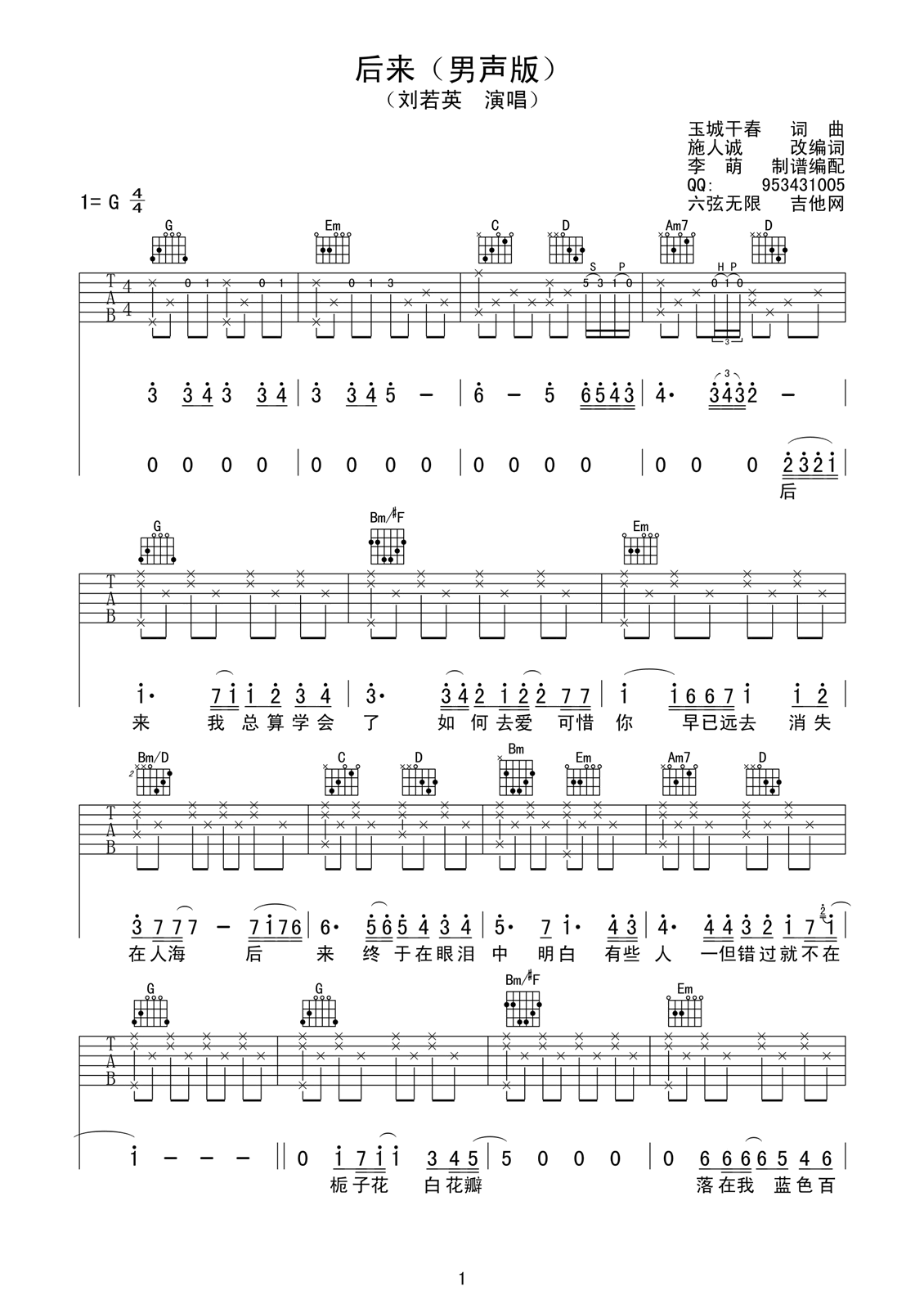 刘若英《后来》吉他谱,六弦无限--李萌编配出品,共有4张高清图谱。...