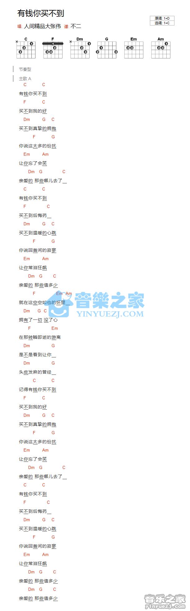 大张伟《有钱你买不到》吉他谱,YYZJ编配出品,共有1张高清图谱,免翻页排版设计。...