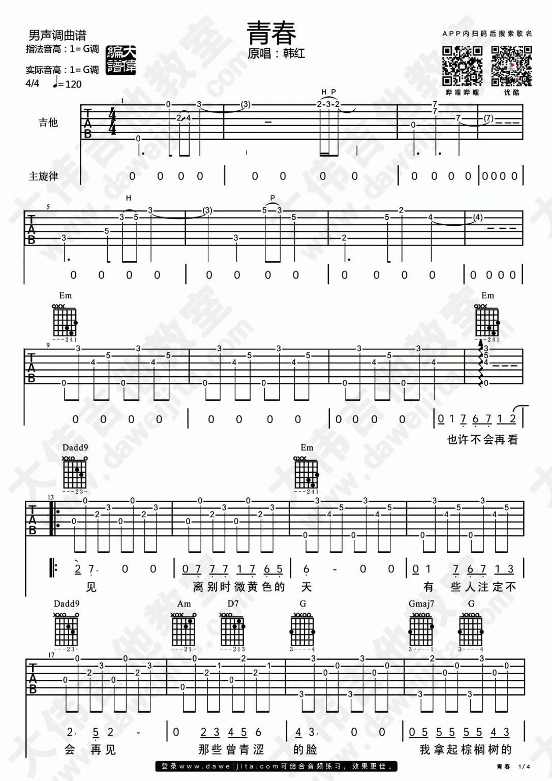 韩红《青春》吉他谱,共有4张高清图谱。...
