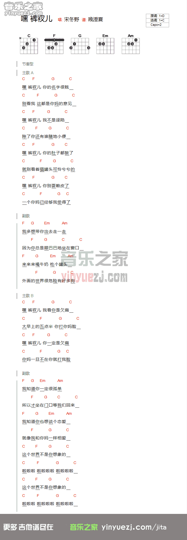 吉他宋冬野《嘿,裤衩儿》吉他谱 - 很多人都在弹的版本