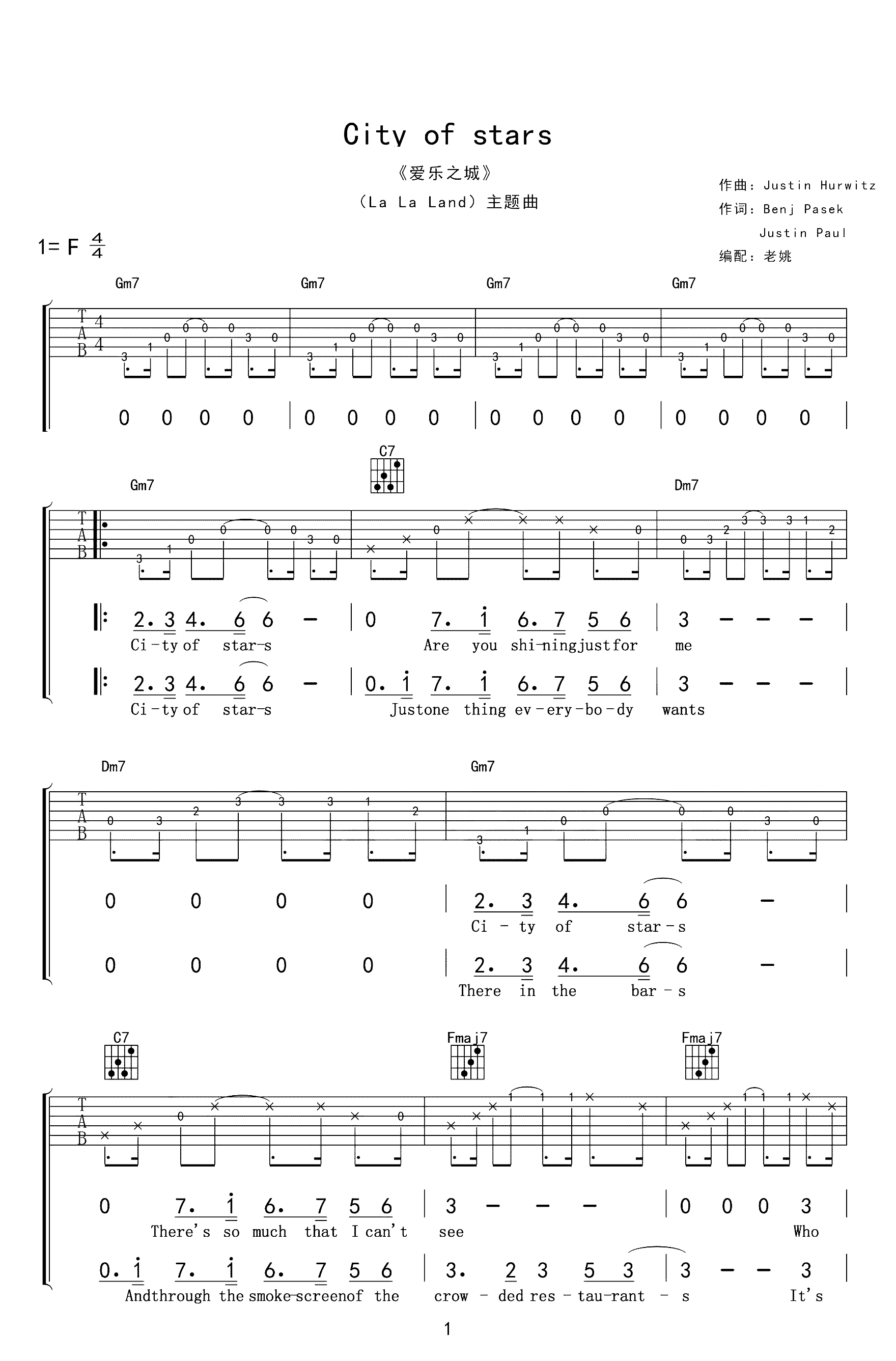 爱乐之城《CityofStars》吉他谱,老姚吉他编配出品,共有4张高清图谱。...